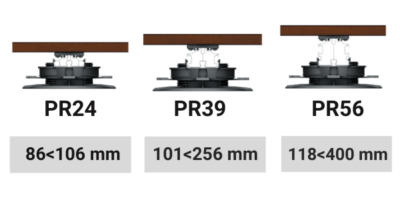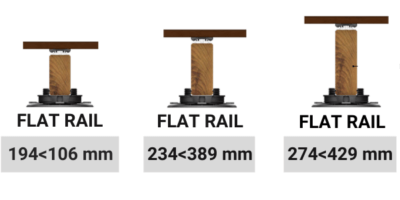 Les hauteurs finies possibles avec ce type de structure sont entre 39 et 47mm. Le flat rail n’est pas porteur, il se visse (référence 1218) sur la lambourde (référence 1676), ou se pose au sol (sol dur impérativement), avec des bandes élastomères (référence 1221-1220). Il est conseillé de ne pas dépasser 8mm d’épaisseur totale de bandes élastomères. Le vissage au sol est non indispensable mais fortement conseillé à l’aide de vis de la référence 1219.